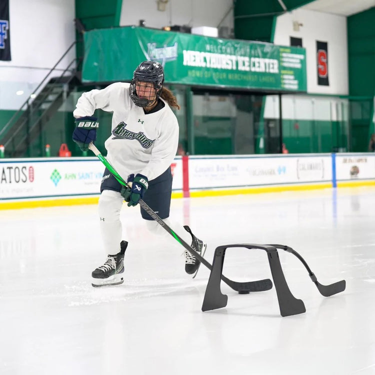 - Simulates a defensive player's feet and stick blade, causing a player to visualize the opponent and learn the spaces that are open on a defender in a game.